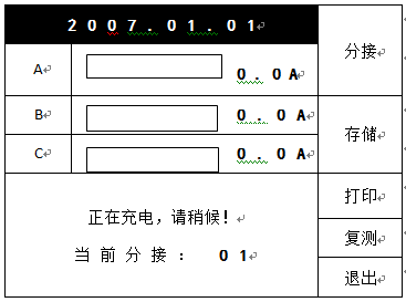 選擇好測量電流,接好三相接線,在初始界面狀態(tài)下按“測量”鍵后,直阻儀進(jìn)入測量狀態(tài),開始給繞組供電。并進(jìn)入如下界面: